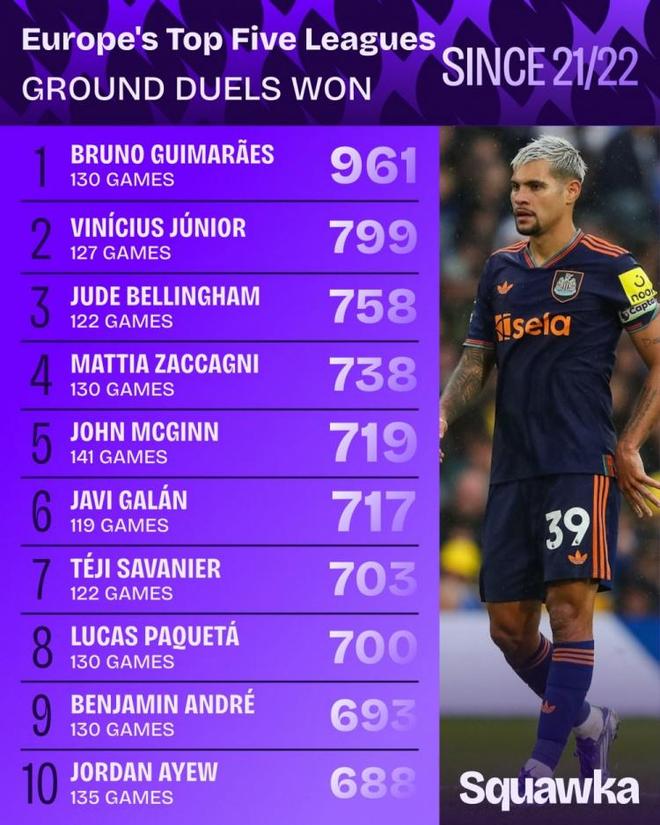 自2021-2022赛季以来,9月11日的实时广播将在五个主要联赛中取得成功的冲突数量,首先是Guimares 961次,Vinicius和Bellingham占据了第二和第三名。 Successful conflict rankings between the five main leagues since season 21-22: Guimares (130 games) - 961 Vinicius (127 games) - 799 Bellingham (122 games) - 758 Zachani (130 games) - 738 McKin (141 games) - 719 Garland (119 games) - 717 Savanier (132 games) - 703 Games) - 703 Games) - 703 Games) - 703(130场比赛)-693 Jordan Ayu(135场比赛)-688