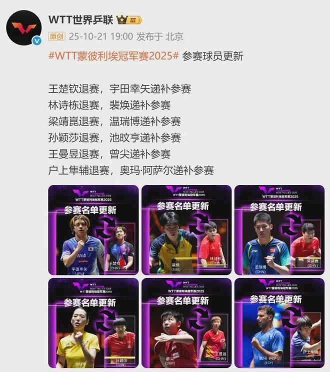 北京时间今日(10月21日)19:00,WTT世界乒联公布了参加2025年WTT蒙彼利埃锦标赛的选手最新信息,王秋琴退出比赛,宇田之希也顶替其参赛。林诗栋退出比赛,由裴凡顶替。梁靖昆退出比赛,温瑞波替补参赛。儿子英莎退出,季敏恒代替她参加。王曼昱退出,曾健代替其参加。户上俊介退出,奥马尔·阿萨尔接替他的位置参加。据悉,2025年WTT蒙彼利埃锦标赛将于10月28日至11月2日在法国蒙彼利埃的法国南部体育场举行。我国第十五届全国乒乓球比赛将于11月7日至20日在澳门举行。根据《关于公布参加第十五届全国乒乓球比赛选手名单的通知》中国乒协10月15日公布的《nnis总决赛》中,王楚钦将代表北京参加男单、男团和混双比赛,林志东将代表海南参加男单比赛,梁靖昆将代表河北省参加男子个人和团体比赛,孙颖莎将代表河北省参加女子个人和团体比赛,王曼昱将代表河北省参加比赛。 黑龙江队参加女子个人和团体比赛,马龙则代表北京队参加男子团体比赛。樊振东将代表上海队参加男子个人和团体比赛。许昕将代表上海参加男子团体比赛。林高远将代表广东省参加男单、男团和混双项目。刘诗雯将代表广东省参加混合比赛 双打项目与女子团体比赛。陈梦将代表山东省参加女子个人和团体比赛。快曼和钱天一将代表江苏队参加了女单、女团和混双比赛。南方都市报(nddaily)报道整合:南都官方微信运营部