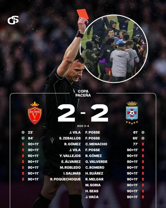 北京时间11月26日,玻利维亚杯四分之一决赛,皇家奥鲁罗2-2战平布鲁明。赛后两队发生大规模对抗,最终17名球员被驱逐。玻利维亚杯四分之一决赛第二回合,布鲁明2-2战平皇家奥鲁罗。首轮比赛,布鲁明2-1击败皇家奥鲁罗,安全晋级半决赛。终场哨响后,双方发生了大规模的对抗。双方球员和工作人员发生争执,场面一度失控。执勤警察不得不使用催泪瓦斯来制止暴力。据玻利维亚《El Potosí》报道,这场争执始于奥鲁罗球星塞巴斯蒂安·塞瓦略斯被布鲁明阻挡。他摇动球并推开对手。他的队友胡里奥·比利亚立即发脾气并挥出一拳,引起混乱。混乱中,奥鲁罗教练马塞洛·罗布雷多与对方教练对峙时被撞倒在地,迫使20名警察出动官员介入维持秩序。紧接着,主教练布鲁明·索里亚带着球员们前往更衣室安抚球员们的情绪。据比赛报道,主裁雷南·卡斯蒂略共出示了11张红牌。布卢明有七名球员被罚下场,奥鲁罗有四名球员被罚下场。罗布雷多、索里亚以及两队第二教练也被驱逐。玻利维亚媒体Vision360透露,卡斯蒂略向玻利维亚体育纪律委员会提交了比赛报告,之后将进行进一步处理。报道还指出,罗布雷多在冲突中肩部受伤,头部受到撞击,被送往医院接受治疗。花官在混乱中身受重伤,颧骨骨折。