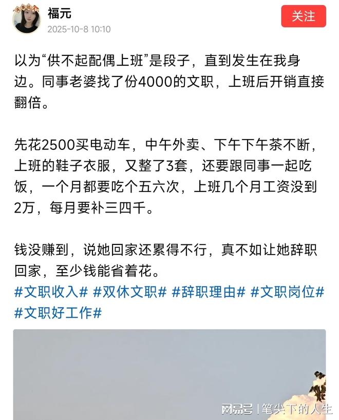近日,有网友表示,他们以为“我保不起配偶的工作”只是一个笑话,直到我真正做到了。同事的妻子找到了一份价值4000元的办公室工作,但自从参加工作以来,她的开支增加了一倍。首先,我花了2500美元买了一辆电动汽车。我们午餐出去吃,下午喝茶。我还买了3套上班用的鞋子和衣服。有时我每个月都会和同事一起吃五六顿饭。我工作几个月的时候,工资还不到2万,所以每个月得挣3-4千。我没有赚到钱,而且我太累了,不想回家。最好让她辞职回家,因为至少可以省钱。这件事情发生后,很多网友也迅速联合起来发表了自己的看法。有网友指出,买limpio请视为花钱。一旦找到工作,你就会有自己的社交圈。不然的话,你每天坐在家里想事情,久而久之你会变得更适合你。有网友评论称,一位亲戚的女儿刚参加工作就怀孕了。她的继父母租了房子来照顾她,中午还给她送饭菜。他们没有勇气让她一个人开车。她的丈夫每天都来接她,但也有没有时间来接她的时候。她自己打车并支付了工作费用。有网友感叹,虽然我在生二胎前就开始工作,但工资只有3000元左右。早餐10元,午餐至少25元,不含晚餐。我丈夫通常付钱。停车费每个月450元,汽油费每周一次300多元。当然,下班后的奶茶和偶尔的晚餐也是必不可少的。现在想想,我觉得生完二胎还是早点回家照顾孩子比较好。有网友回应德:“我也是。” “我的月薪3000到4000元还不够,我丈夫的月薪是2000元。”真正是自己挣的,自己花的,想怎么花就怎么花。养家糊口是男人的责任。现代社会,花钱的地方有很多。很多人只需要月薪。自己用还不够。例如,您最大的开支是租金或抵押贷款,其次是食物。如果自己不做饭,每个人每天至少要在吃饭上花费50元以上,更不用说买衣服等杂费了。您对此有何看法?